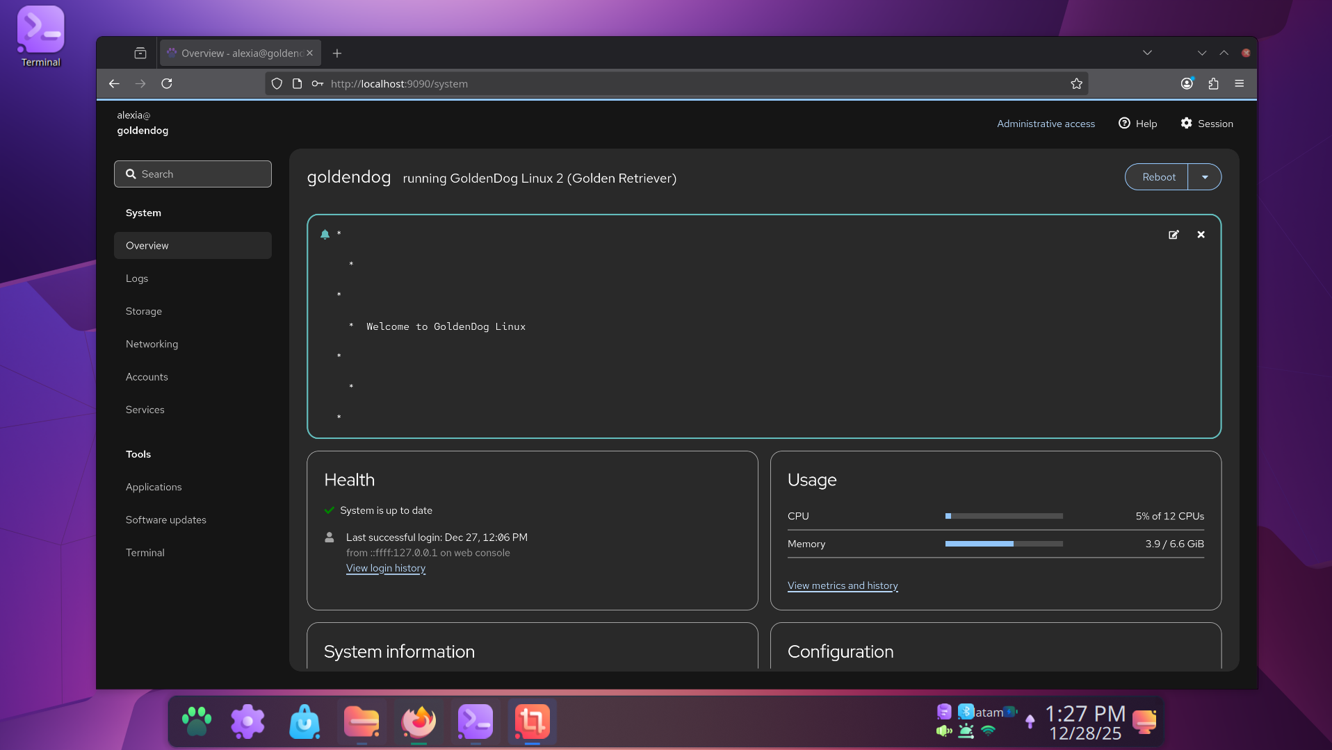 GoldenDog Linux comes pre-configured with Cockpit, giving you a powerful web-based interface to manage your system, monitor performance, and handle updates with zero effort.